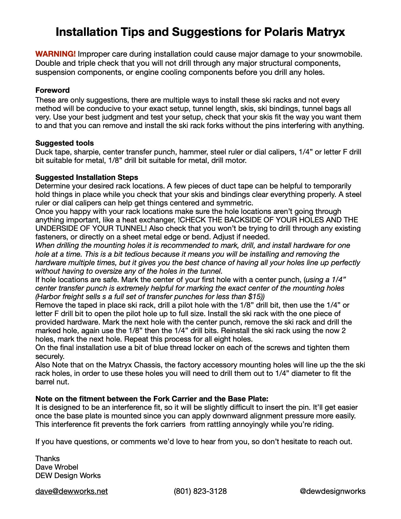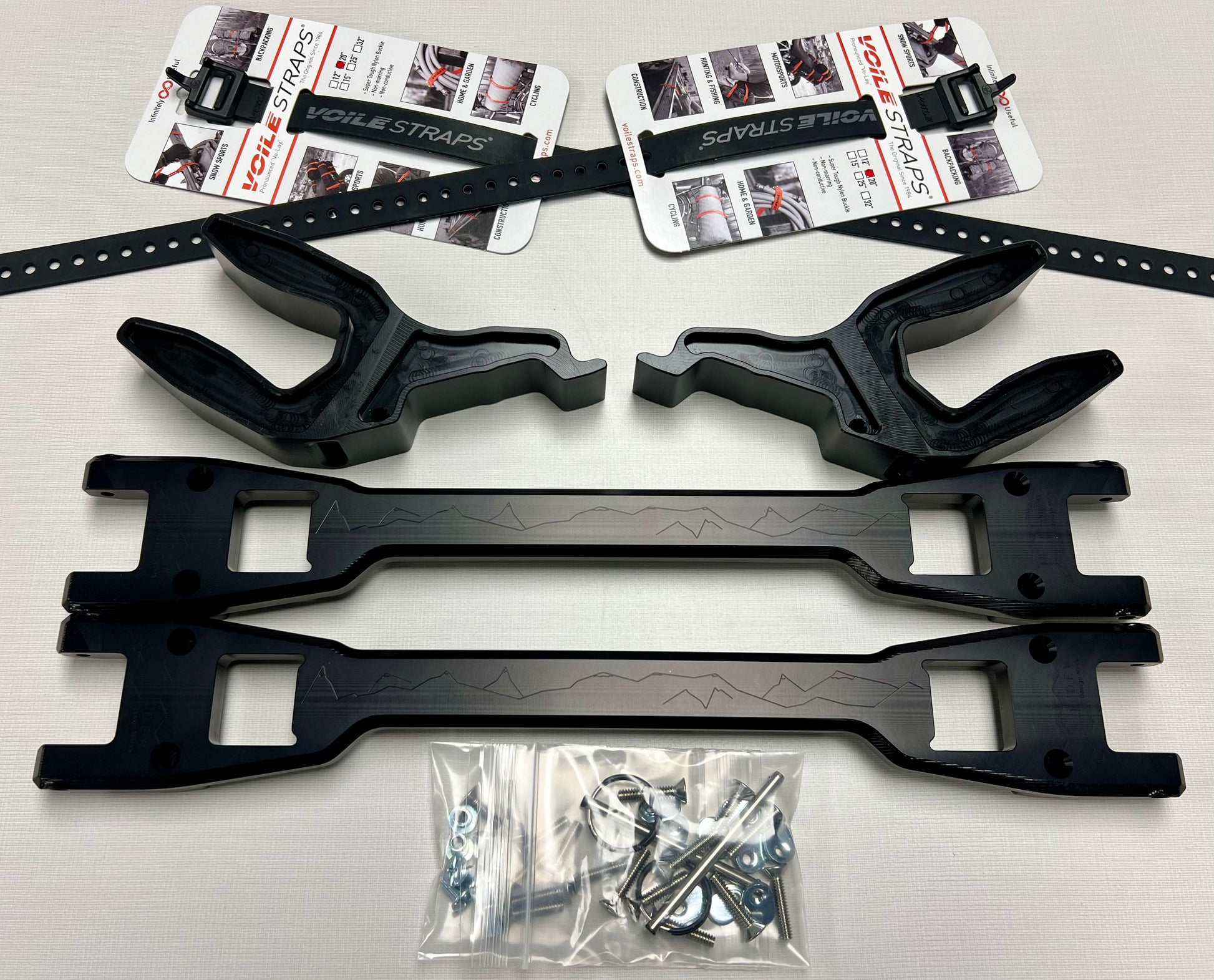 This is the Base System rack for Polaris Matryx chassis snowmobiles. It utilizes the factory accessory mounting holes on the tunnel (opening the holes to 1/4" diameter is required). The set includes two mounting bases, two forks, two retaining pins, two Voile straps of your color choice, and the mounting hardware. This is enough to carry one set of skis, or one snowboard.